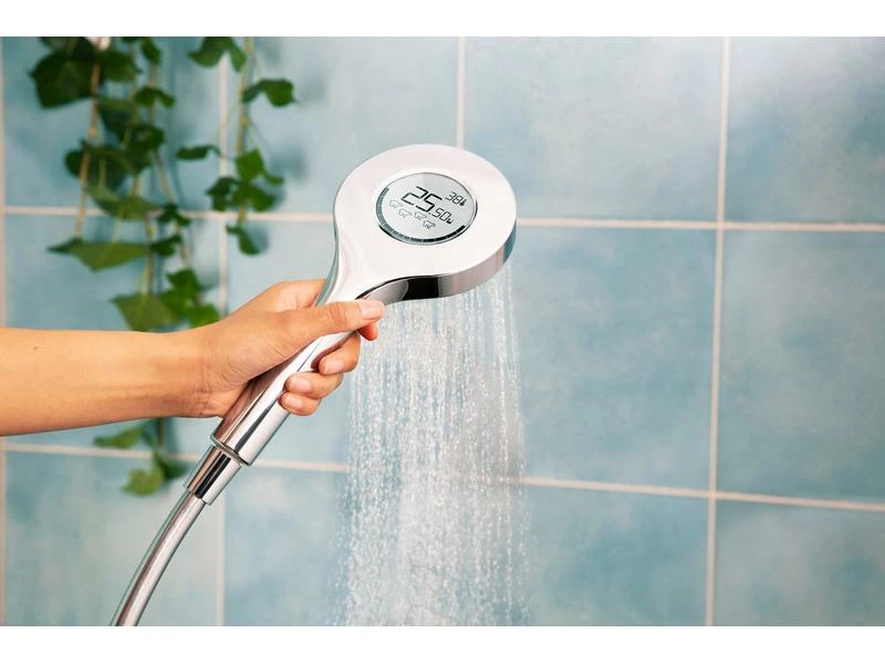 Die Handbrause zeigt Ihnen den aktuellen Energieverbrauch an und motiviert zu einem bewussten Umgang mit Energie sowie zur Schonung der Energie- und Wasserressourcen. Mit der zugehörigen kostenfreien App behalten Sie Ihren Verbrauch nicht nur stets im Blick, sondern können darüber hinaus auch den Verlauf und die Trends Ihres Verbrauchs über die Zeit beobachten. Die Echtzeit-Informationen verhelfen zur jährlichen Einsparung von durchschnittlich 22% Energie und 3’500 Liter in einem 3-Personen-Haushalt. Durch Energie- und Wassereinsparungen sparen Sie auch Geld – Sie können also davon ausgehen, dass sich das Gerät mit der Zeit selbst finanziert.