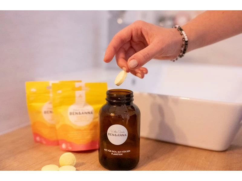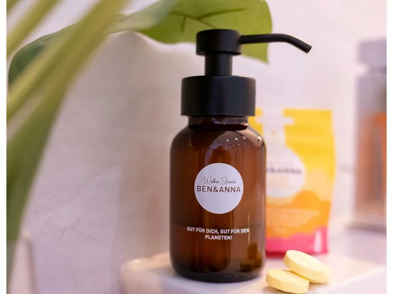 So einfach geht Zero Waste im Badezimmer! Mit dem Ben & Anna Wolkenspender wird unnötiger Transport von Wasser gespart. Zwei Tabletten direkt in die Flasche geben, mit Wasser auffüllen und fertig ist der wolkig-leichte Seifenschaum. Der Wolkenspender ist nicht nur stylish chic, sondern auch aus edlen Materialien. Edles Braunglas vereinigt sich mit einer Pumpe aus robustem Edelstahl. Zero Waste im Badezimmer war noch nie so einfach und stylish.