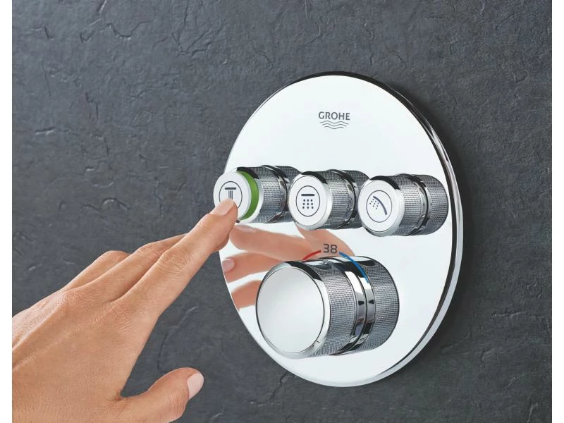 Das Grohtherm SmartControl Unterputz-Thermostat besticht durch sein reduziertes, elegantes Design und bietet Ihnen die Möglichkeit, mehrere Wasserquellen gleichzeitig zu steuern. Mithilfe der innovativen SmartControl Technologie können Sie Ihre gewünschte Strahlquelle auswählen und die Wassermenge durch Drücken und Drehen eines Knopfes regeln. Die drei Ventile ermöglichen eine hohe Flexibilität: Unabhängig von der Duscheinstellung können Sie verschiedene Strahlbilder und Wasserausläufe regeln, kombinieren oder auch zwischen ihnen wechseln – perfekt für Badezimmer mit Badewanne sowie einer Dusche mit Hand-, Kopf- und Seitenbrausen. Die integrierte GROHE TurboStat Technologie beugt unerwünschten Temperaturschwankungen vor. Dank der GROHE EasyLogic Kennzeichnungen und der Struktur der Knöpfe mit auswechselbaren Symbolen sind diese leicht und intuitiv zu bedienen. Die familienfreundliche Überbrückungstaste GROHE SafeStop ermöglicht es, eine maximale Temperatur von 38 °C einzustellen. So lassen sich Verbrennungen verhindern. Mit dem optionalen GROHE SafeStop Plus Temperaturbegrenzer lässt sich ein weiterer Höchstwert von 43 °C für zusätzliche Sicherheit ergänzen. Die wassersparende GROHE EcoJoy Technologie bietet die Möglichkeit, den Volumenstrom zu reduzieren ohne das Duscherlebnis zu beeinträchtigen. Dank des GROHE QuickFix Systems ist die Montage schnell und direkt möglich. Das schlanke Profil erleichtert die Reinigung. Die glänzende, langlebige GROHE StarLight Chromoberfläche sieht auch nach Jahren noch makellos aus. Durch das schlanke, runde Design, das perfekt zur minimalistischen Optik passt, wird das Badezimmer-Design vollkommen. Bitte beachten Sie, dass dieser Thermostat zusammen mit der GROHE Rapido SmartBox (35600000) montiert werden muss.