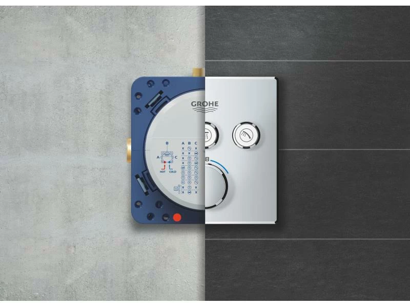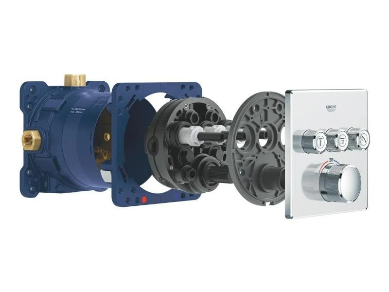 Das Grohtherm SmartControl Unterputz-Thermostat besticht durch sein reduziertes, elegantes Design und bietet Ihnen die Möglichkeit, mehrere Wasserquellen gleichzeitig zu steuern. Mithilfe der innovativen SmartControl Technologie können Sie Ihre gewünschte Strahlquelle auswählen und die Wassermenge durch Drücken und Drehen eines Knopfes regeln. Die drei Ventile ermöglichen eine hohe Flexibilität: Unabhängig von der Duscheinstellung können Sie verschiedene Strahlbilder und Wasserausläufe regeln, kombinieren oder auch zwischen ihnen wechseln – perfekt für Badezimmer mit Badewanne sowie einer Dusche mit Hand-, Kopf- und Seitenbrausen. Die integrierte GROHE TurboStat Technologie beugt unerwünschten Temperaturschwankungen vor. Dank der GROHE EasyLogic Kennzeichnungen und der Struktur der Knöpfe mit auswechselbaren Symbolen sind diese leicht und intuitiv zu bedienen. Die familienfreundliche Überbrückungstaste GROHE SafeStop ermöglicht es, eine maximale Temperatur von 38 °C einzustellen. So lassen sich Verbrennungen verhindern. Mit dem optionalen GROHE SafeStop Plus Temperaturbegrenzer lässt sich ein weiterer Höchstwert von 43 °C für zusätzliche Sicherheit ergänzen. Die wassersparende GROHE EcoJoy Technologie bietet die Möglichkeit, den Volumenstrom zu reduzieren ohne das Duscherlebnis zu beeinträchtigen. Dank des GROHE QuickFix Systems ist die Montage schnell und direkt möglich. Das schlanke Profil erleichtert die Reinigung. Die glänzende, langlebige GROHE StarLight Chromoberfläche sieht auch nach Jahren noch makellos aus. Durch das schlanke, runde Design, das perfekt zur minimalistischen Optik passt, wird das Badezimmer-Design vollkommen. Bitte beachten Sie, dass dieser Thermostat zusammen mit der GROHE Rapido SmartBox (35600000) montiert werden muss.