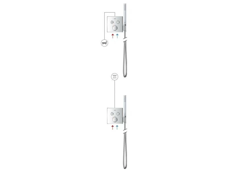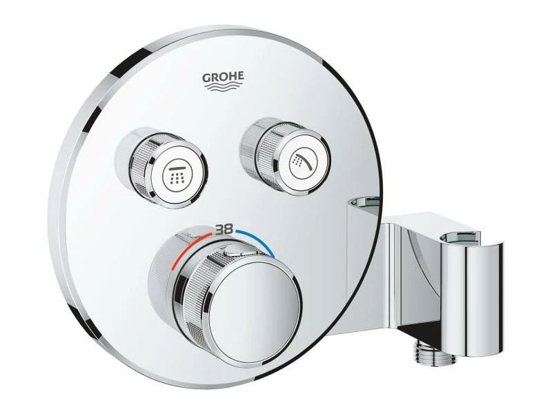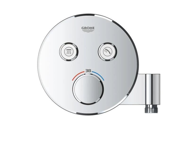 Das Grohtherm SmartControl Unterputz-Thermostat verfügt über einen integrierten Duschanschluss sowie eine Halterung für Ihre Handbrause. Es besticht durch sein reduziertes und elegantes Design. Mithilfe der innovativen SmartControl Technologie können Sie Ihre gewünschte Strahlquelle auswählen und die Wassermenge durch Drücken und Drehen eines Knopfes regeln. Dank der zwei Ventile können Sie mühelos zwischen Kopf- und Handbrause bzw. zwischen Dusche und Badewanne wechseln oder auch beides kombinieren. Die integrierte GROHE TurboStat Technologie beugt unerwünschten Temperaturschwankungen vor. Dank der GROHE EasyLogic Kennzeichnungen und der Struktur der Knöpfe mit auswechselbaren Symbolen sind diese leicht und intuitiv zu bedienen. Die familienfreundliche Überbrückungstaste GROHE SafeStop ermöglicht es, eine maximale Temperatur von 38 °C einzustellen. So lassen sich Verbrennungen verhindern. Mit dem optionalen GROHE SafeStop Plus Temperaturbegrenzer lässt sich ein weiterer Höchstwert von 43 °C für zusätzliche Sicherheit ergänzen. Die wassersparende GROHE EcoJoy Technologie bietet die Möglichkeit, den Volumenstrom zu reduzieren ohne zu Beeinträchtigungen beim Duscherlebnis zu führen. Dank des GROHE QuickFix Systems ist die Montage schnell und direkt möglich. Das schlanke Profil erleichtert die Reinigung. Die glänzende, langlebige GROHE StarLight Chromoberfläche sieht auch nach Jahren noch makellos aus. Durch das schlanke, runde Design, das perfekt zur minimalistischen Optik passt, wird das Badezimmer-Design vollkommen. Bitte beachten Sie, dass dieser Thermostat zusammen mit der GROHE Rapido SmartBox (35600000) montiert werden muss.