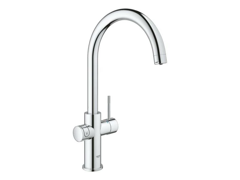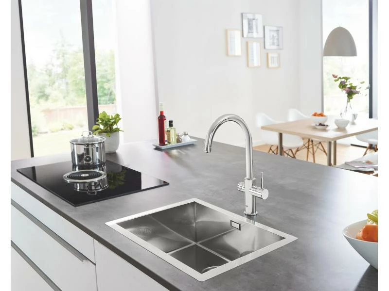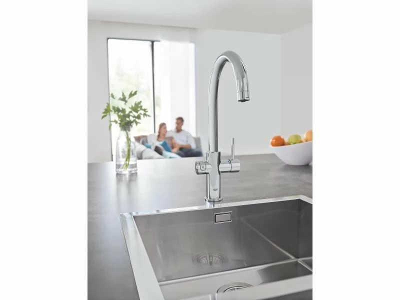 Dieses Set umfasst eine GROHE Blue Einhand-Armatur sowie einen GROHE Blue Home Kühler inklusive einem Filter und einer CO2-Flasche. Die Blue Home Duo Armatur bietet Ihnen ein grossartiges Design. Der hohe C-Auslauf mit 150°-Drehoption eignet sich bestens für einen hohen Bedienkomfort. Für gefiltertes und nicht gefiltertes Wasser wird der filigrane Körper über getrennte Wasserleitungen im Inneren gespeist. Bei normalem Betätigen des Hebels, erhalten Sie gewöhnliches Wasser zum Abspülen. Über das Betätigen des LED-Druckknopfes, aktivieren Sie den Filter und erhalten gekühltes oder sprudelndes Wasser. Die charakteristische Formgebung von GROHE kennzeichnet diese Monoblock-Spültischarmatur. Sie bietet die glänzende GROHE StarLight Chromoberfläche, sowie die langlebigen integrierten GROHE SilkMove Mechanismen für hohen Bedienkomfort. Da im Set alle erforderlichen Teile enthalten und keine zusätzlichen Leitungen erforderlich sind, nimmt die Montage nur 30 Minuten in Anspruch.