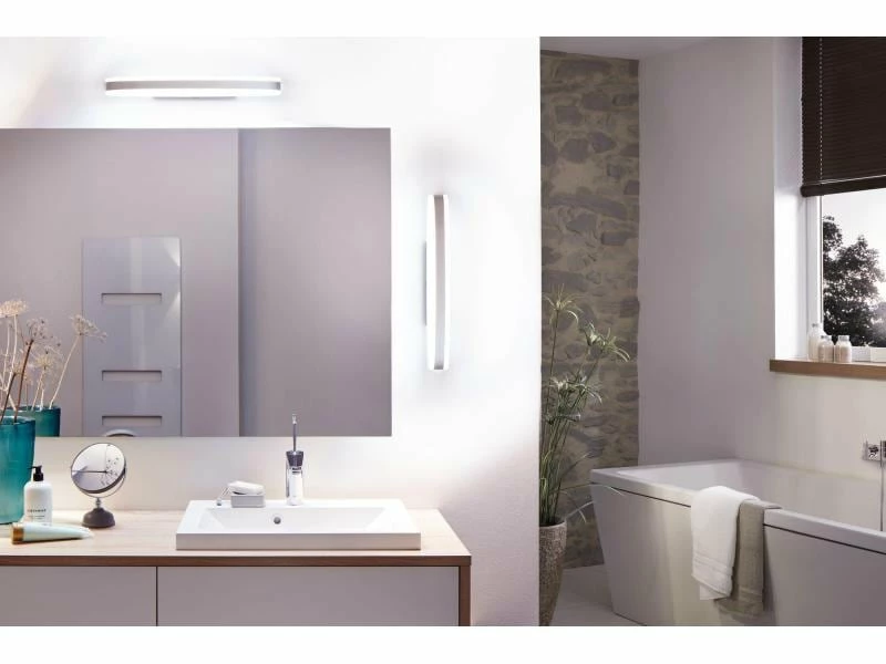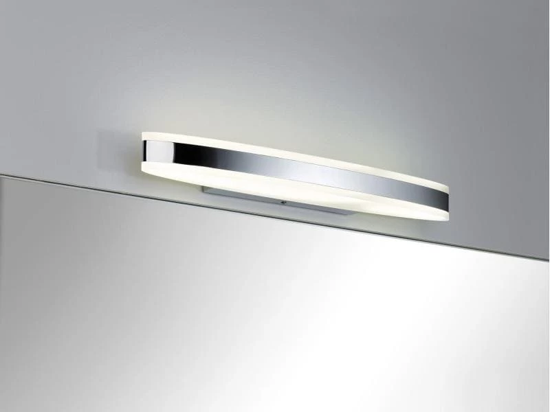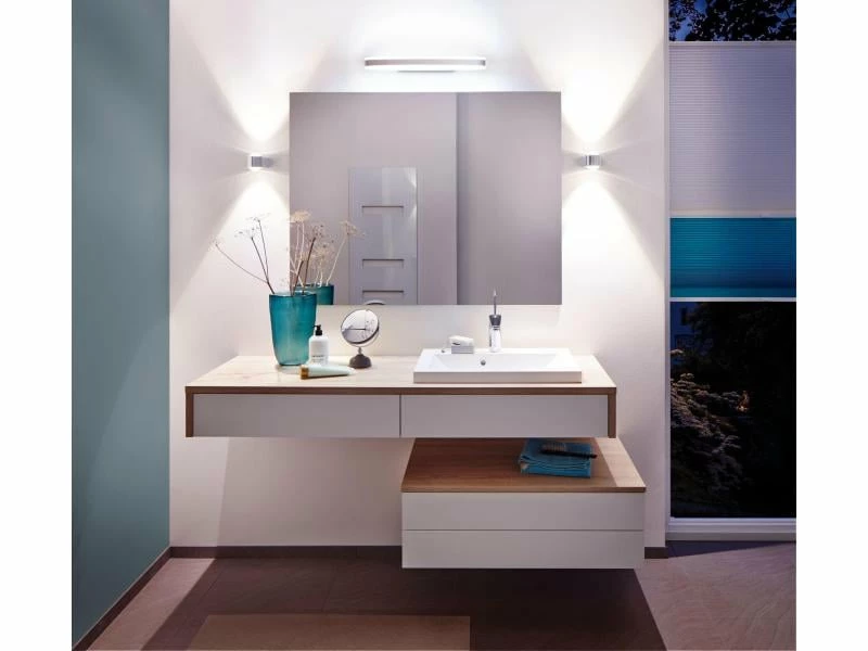 Die Kuma Spiegelleuchte kann durch den Spritzwasserschutz direkt über dem Spiegel montiert werden. Der verchromte Blendschutz hat eine positive Wirkung auf die Optik der Badleuchte.
