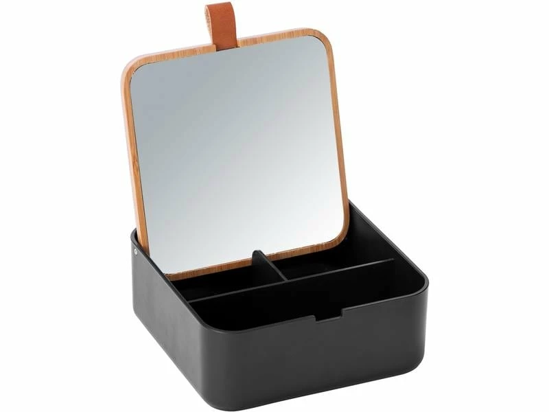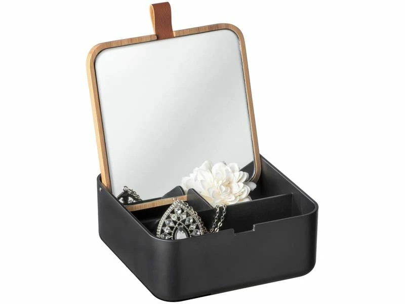 - Die Box ist mit drei Fächern ausgestattet und im Deckel mit Schlaufe befindet sich ein Spiegel