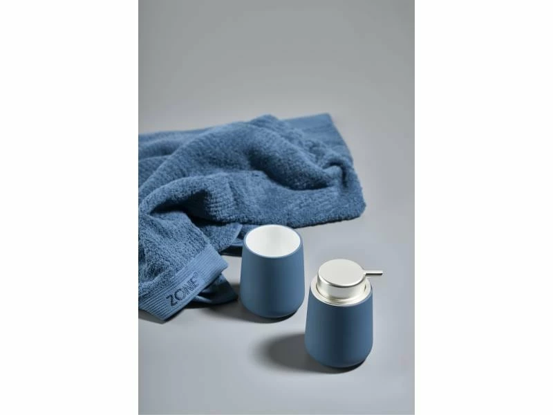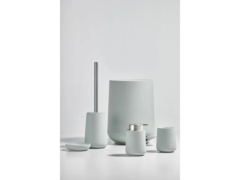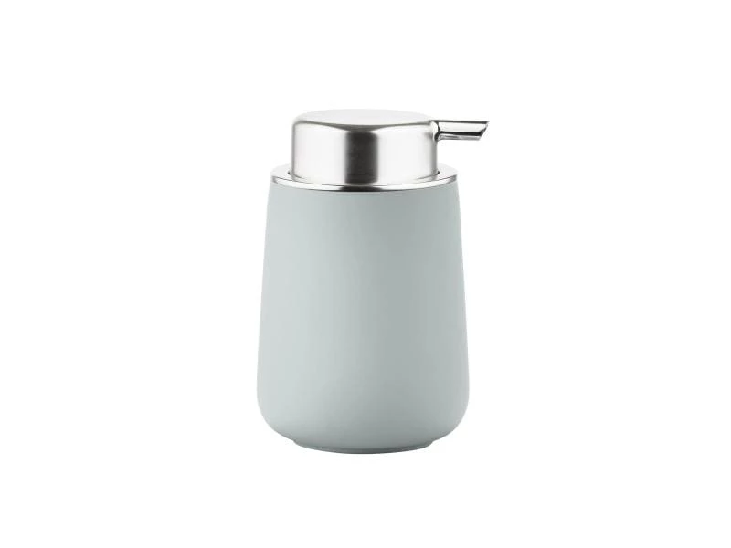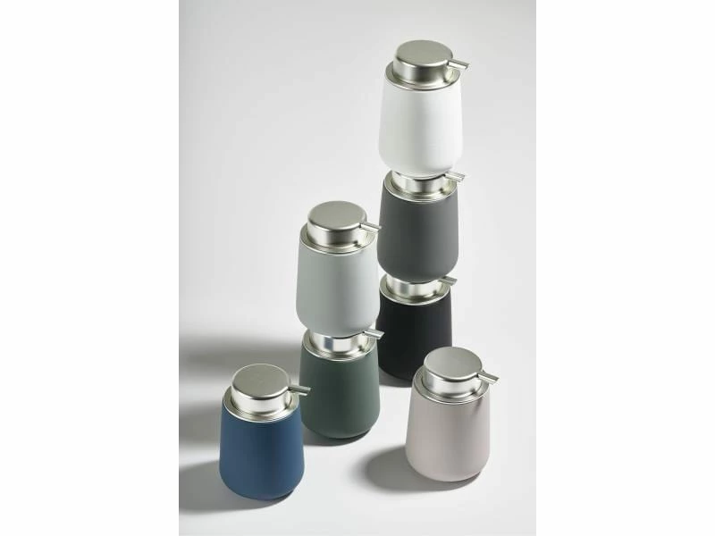 Der Seifenspender Nova von Zone wurde aus Porzellan gefertigt und mit einem Kunststoff überzogen, damit eine griffige Oberfläche entstand. Der Benutzer drückt einfach den ganzen Deckel nach unten, um Seife zu erhalten. Wenn Sie den Pumpdeckel entfernen, können Sie die Seife über die grosse Öffnung bequem nachfüllen.